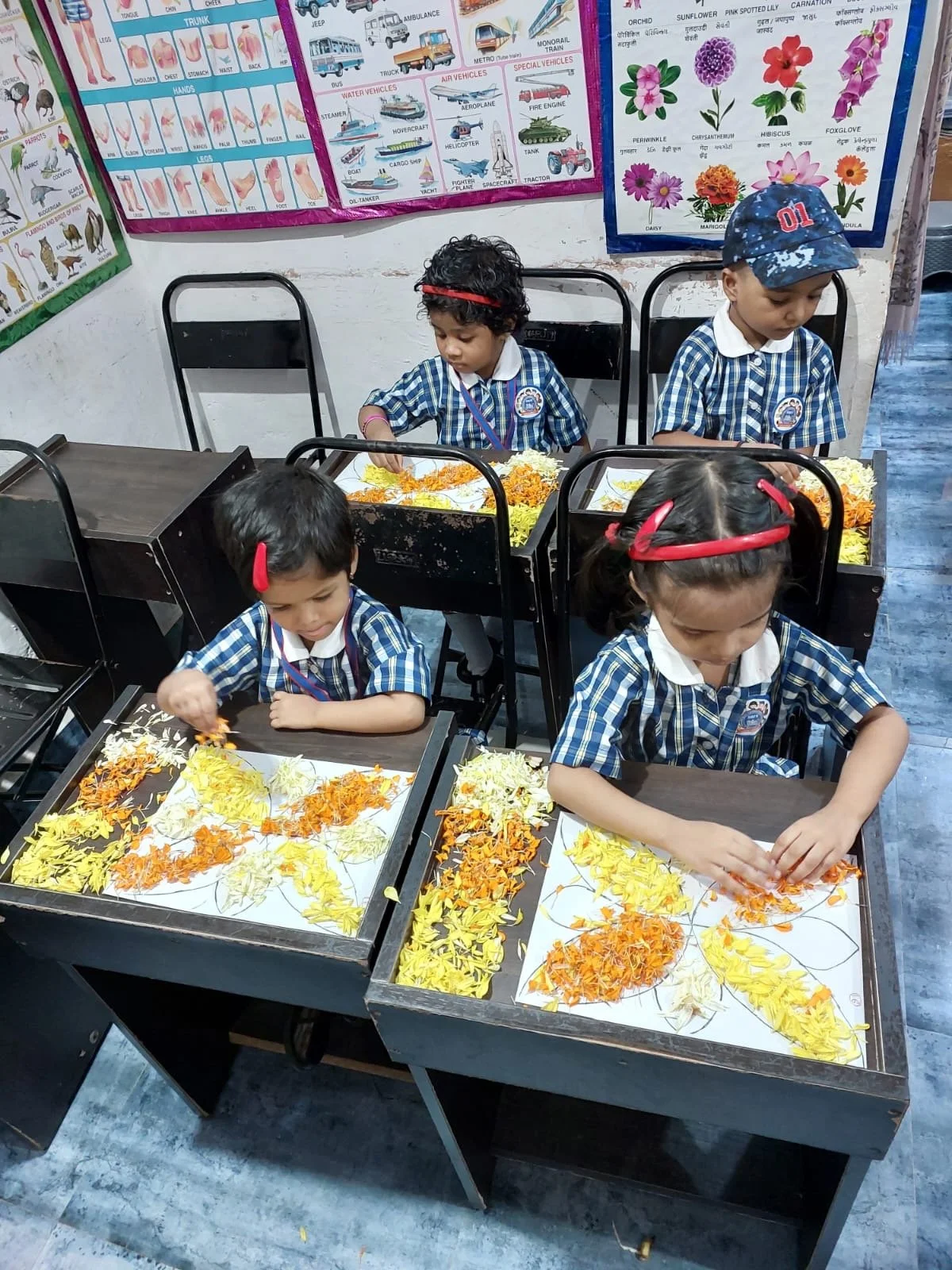 Students making Rangoli with flowers, showing the school’s art based curriculum